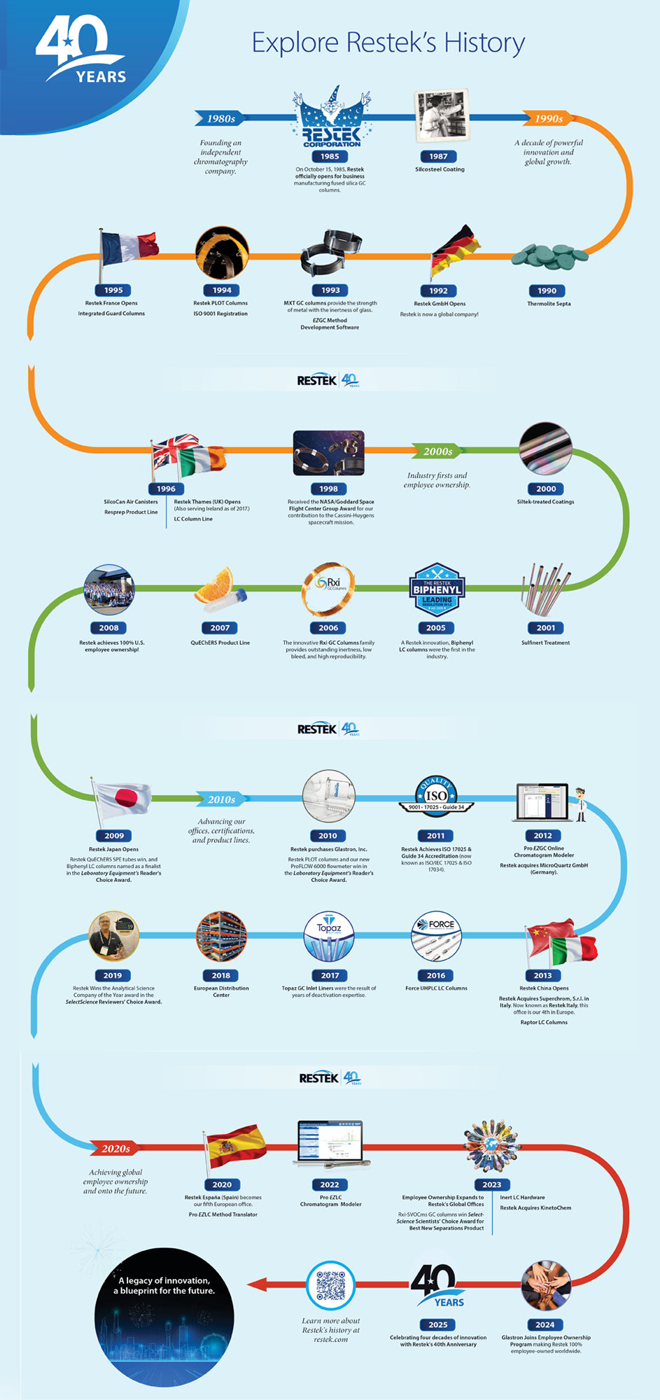 Trong suốt Restek 40 năm đổi mới, công ty đã liên tục tiên phong trong công nghệ, không ngừng tạo ra các sản phẩm và tiêu chuẩn mới cho ngành sắc ký toàn cầu.