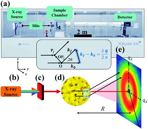 Hình 1: (a) Thiết bị SAXS trong phòng thí nghiệm của Penn. Tia X được tạo ra tại điểm (b) và tia X đơn sắc và chuẩn trực tại điểm (c). Chùm tia bắn phá vật liệu tại điểm (d), nơi tia X thực hiện một trong ba việc: tán xạ với các electron trong vật liệu, truyền qua vật liệu hoặc hấp thụ vào vật liệu. Chùm tia đã truyền và sóng phân tán thứ cấp truyền xuống một ống hút chân không có chiều dài R, và được phát hiện tại điểm (e). NCS đảm nhiệm chính: Sam Welborn. Tham khảo: S.S. Welborn và E. Detsi, Nanoscale Horizons, 2019. DOI10.1039 / C9NH00347A
